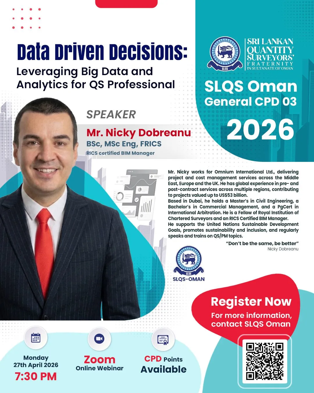 The Data Driven Decisions for Quantity Surveyors CPD session organized by SLQS Oman brings a valuable opportunity for QS professionals to enhance their knowledge in Big Data and Analytics and apply modern digital tools in cost management and project delivery.